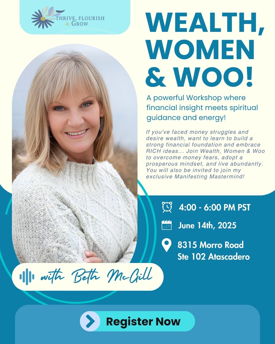 Join me for Wealth, Women & Woo, a transformational money mindset workshop designed to help you: